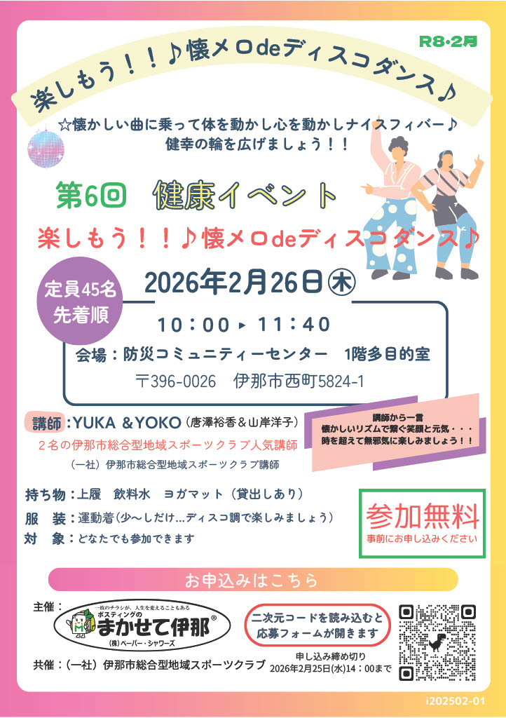 「健康イベント~楽しもう!!♪懐メロdeディスコダンス♪~」を開催します。