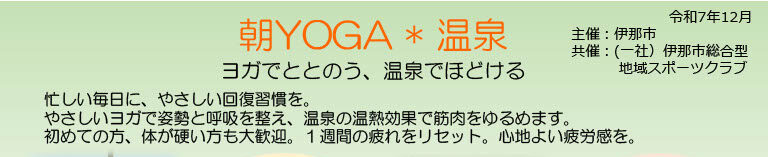 1月より、伊那市の温泉施設(さくらの湯、みはらしの湯)で「朝YOGA×温泉」がスタートします。 各会場の日程・時間・参加費 ...